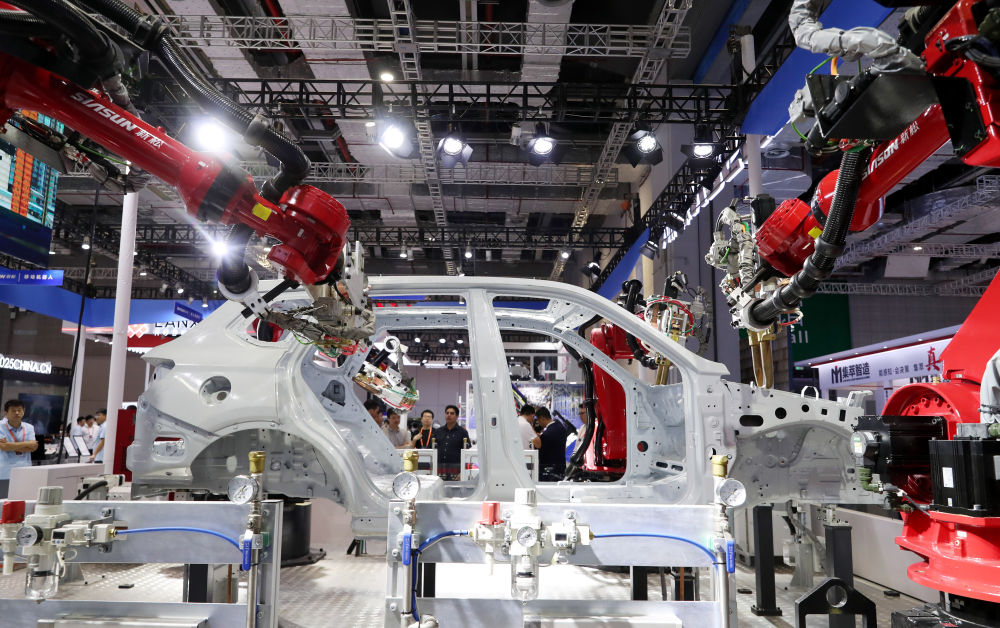 一組車身焊接機(jī)器人在第二十三屆中國(guó)國(guó)際工業(yè)博覽會(huì)上進(jìn)行作業(yè)演示(2023年9月19日攝)。新華社記者 方喆 攝
