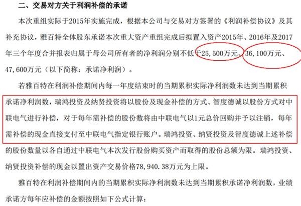 如果這一承諾沒(méi)有達(dá)成,交易對(duì)手方需要以股份或現(xiàn)金的形式對(duì)中聯(lián)電氣進(jìn)行補(bǔ)償。