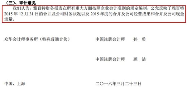 在2015年的年度報(bào)告中,眾華會(huì)計(jì)事務(wù)所對(duì)雅百特出具了審計(jì)意見(jiàn),認(rèn)為“雅百特財(cái)務(wù)報(bào)表在所有重大方面按照企業(yè)會(huì)計(jì)準(zhǔn)則的規(guī)定編制,公允反映了雅百特2015年12月31日的合并及公司財(cái)務(wù)狀況以及2015年度的合并及公司經(jīng)營(yíng)成果和合并及公司現(xiàn)金流量”。