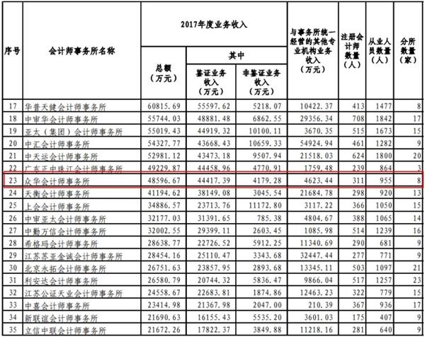 此外,在中注協(xié)發(fā)布的2017年業(yè)務(wù)收入前100家會(huì)計(jì)師事務(wù)所數(shù)據(jù)中,眾華會(huì)計(jì)師事務(wù)所排名第23,在2017年的業(yè)務(wù)收入達(dá)到4.86億元,事務(wù)所擁有注冊(cè)會(huì)計(jì)師311人、從業(yè)人員數(shù)量達(dá)955人,共有8家分所。