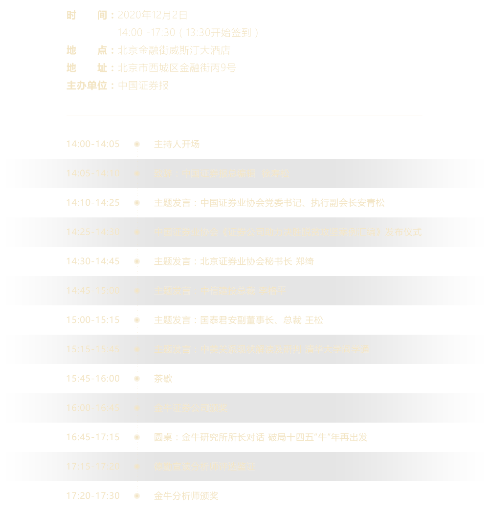 本次論壇將公布“2020中國證券報(bào)證券業(yè)金牛獎(jiǎng)”評(píng)選結(jié)果。“中國證券報(bào)證券業(yè)金牛獎(jiǎng)”分設(shè)“證券業(yè)分析師金牛獎(jiǎng)”和“證券公司金牛獎(jiǎng)”兩大獎(jiǎng)項(xiàng)。本次“證券業(yè)分析師金牛獎(jiǎng)”將繼續(xù)發(fā)揮“金?!逼放朴绊懥Γ永m(xù)以“金?!边x“金?!钡淖谥迹貧w研究本色,緊跟時(shí)代步伐,貼合行業(yè)實(shí)際,評(píng)選出“主觀投票榜”和“客觀量化榜”兩個(gè)榜單。