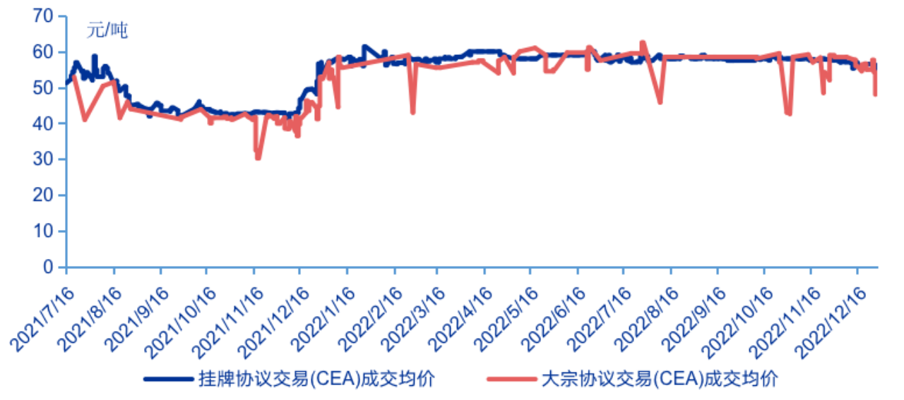 交易價(jià)格穩(wěn)中有升,在碳價(jià)調(diào)控機(jī)制下價(jià)格穩(wěn)定性增強(qiáng)。2022年掛牌協(xié)議交易成交均價(jià)為58.1元/噸,相比2021年提升了24.6%;大宗協(xié)議交易成交均價(jià)55元/噸,較2021年上升22%。值得注意的是,與2021年相比,2022年碳市場(chǎng)成交均價(jià)波動(dòng)幅度收窄,主要原因有兩方面,一方面,全國(guó)碳市場(chǎng)通過(guò)碳價(jià)調(diào)控機(jī)制對(duì)碳價(jià)進(jìn)行管理,通過(guò)對(duì)碳價(jià)漲幅、交易者頭寸和交易量等進(jìn)行調(diào)控,使得碳價(jià)呈現(xiàn)出良好的波動(dòng)表現(xiàn);另一方面,2022年全國(guó)碳市場(chǎng)的工作重點(diǎn)集中在數(shù)據(jù)質(zhì)量治理體系和碳配額分配方案的完善,披露制度和配額制度的健全使市場(chǎng)體系更完善,價(jià)格更具韌性,將進(jìn)一步有利于碳市場(chǎng)發(fā)揮價(jià)格發(fā)現(xiàn)功能,更好地反映市場(chǎng)供需關(guān)系。