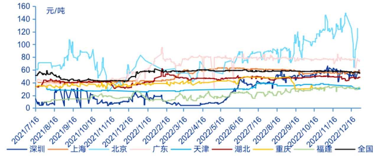 圖3:2021—2022年地方碳市場(chǎng)交易價(jià)格情況