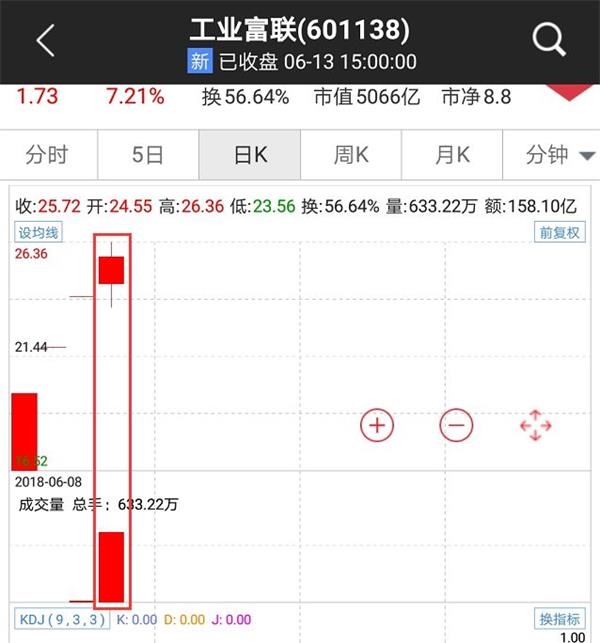 上周五剛在A股上市的富士康(股票簡稱:工業(yè)富聯(lián),股票代碼:601138),在連續(xù)三個(gè)一字漲停板后,終于打開漲停,并放出巨量,13日全天合計(jì)成交158.1億元,換手率高達(dá)56.64%。值得注意的是,滬市13日成交1559.35億元,這意味著富士康13日成交額已超過滬市1/10。