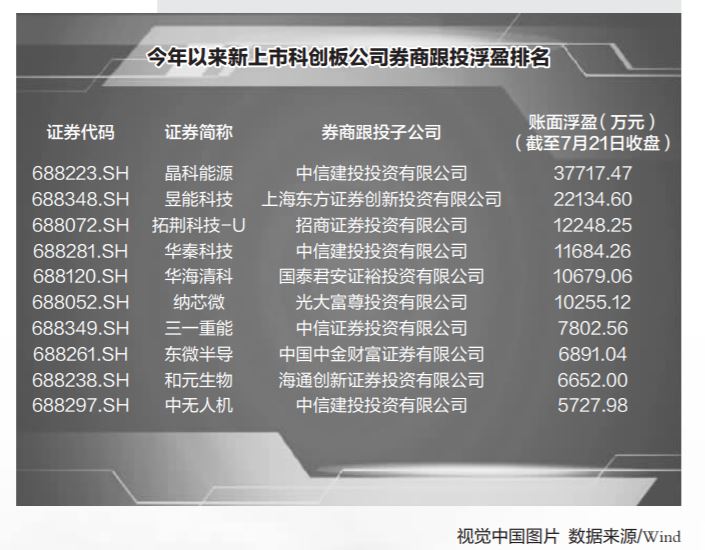 科創(chuàng)板跟投制度也使得不少券商能從投資角度分享優(yōu)質(zhì)公司價值。Wind數(shù)據(jù)顯示,截至7月21日,科創(chuàng)板今年以來有近60家公司完成發(fā)行上市,其中有超過40家公司為其跟投券商帶來了賬面浮盈。中信建投證券子公司中信建投投資有限公司跟投晶科能源,截至7月21日收盤,其賬面浮盈已超過3.77億元。