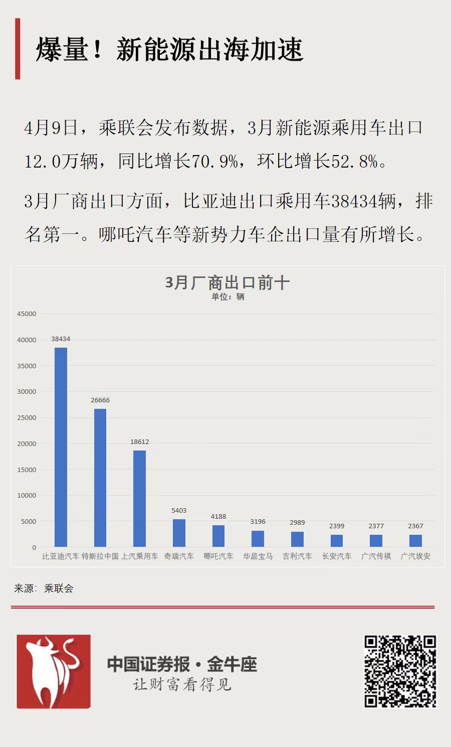 4月9日,乘聯(lián)會發(fā)布的數(shù)據(jù)顯示,3月新能源乘用車出口12.0萬輛,同比增長70.9%,環(huán)比增長52.8%,占乘用車出口29.7%,較去年同期增長5.6個百分點。其中,純電動占比新能源出口的82.3%,A0+A00級純電動出口占自主新能源出口的58%。