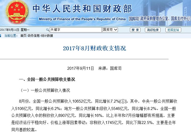 財政部:8月份全國財政收入10652億元 同比增7.2%