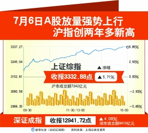 7月6日,“A股!北寂芴崴伲荷献C綜指大漲5.71%并站上3300點(diǎn),兩市成交額突破1.5萬(wàn)億元大關(guān),股指期貨IH主力2007合約一度漲停、新加坡A50期指主力創(chuàng)逾12年新高……