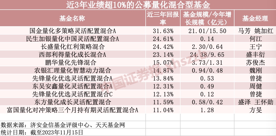 更有3只公募量化混合型基金,實(shí)現(xiàn)連續(xù)三年以上的正收益,分別是國金量化多策略靈活配置混合A、民生加銀量化中國靈活配置混合A、富國量化對(duì)沖策略三個(gè)月持有期靈活配置混合A。