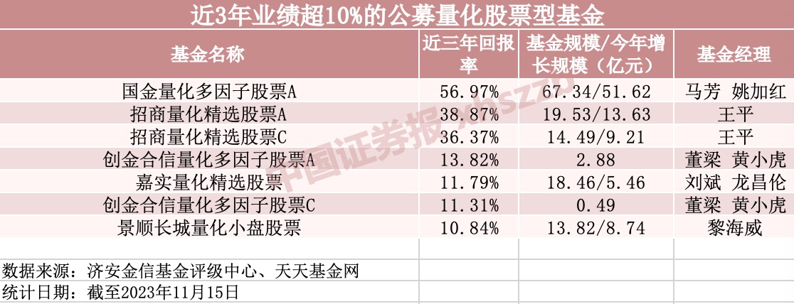 與此同時(shí),濟(jì)安金信基金評(píng)價(jià)中心統(tǒng)計(jì)數(shù)據(jù)顯示,截至11月15日,全市場共有公募股票型量化基金108只,成立一年以上的有106只,成立三年以上的有53只。其中,近三年回報(bào)率超過10%的共有7只。