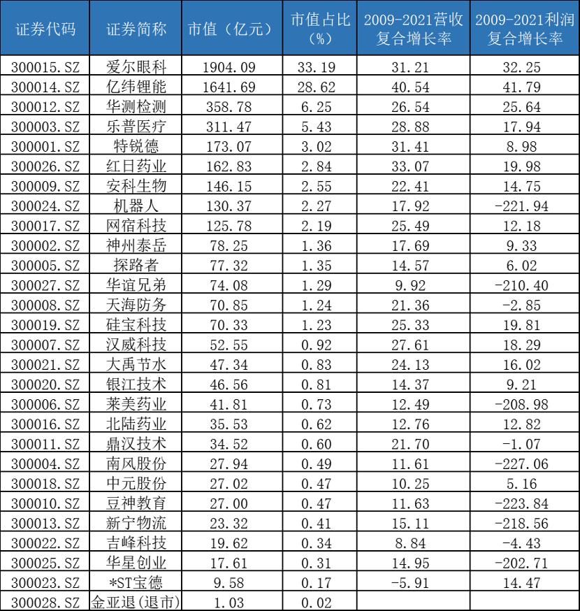 創(chuàng)業(yè)板首批28家公司在2009年10月底掛牌上市,十余年之后回首再看,其中多家公司已經被借殼或者并購重組改名,甚至還有一家公司目前處于*ST狀態(tài),還有家已經退市(金亞退),但是也不乏諸如愛爾眼科和億緯鋰能等如今創(chuàng)業(yè)板指數(shù)的權重股:
