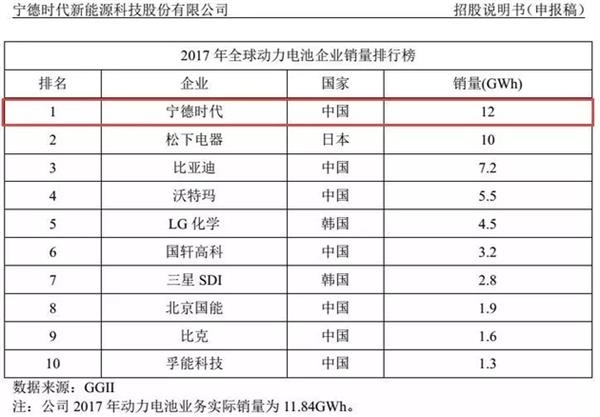 寧德時(shí)代招股書(shū)顯示,公司2017年動(dòng)力電池的銷(xiāo)量為11.84GWh,在全球排名第一,排名第二和第三的分別是松下和比亞迪,韓國(guó)知名企業(yè)LG化學(xué)和三星SDI分別位居第五位和第七位。