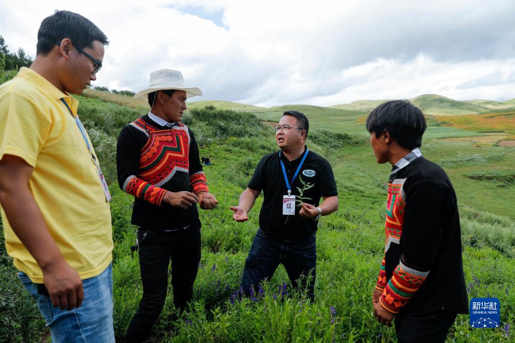 在位于四川省涼山彝族自治州昭覺縣龍溝鄉(xiāng)境內(nèi)黃芩種植基地,西南醫(yī)科大學(xué)副教授夏紀(jì)毅(右二)和該校派出的駐村工作隊員俄且莫機(jī)(左一)為當(dāng)?shù)匾妥迦罕娭v授黃芩種植和采摘技術(shù)(2020年8月14日攝)。新華社記者 沈伯韓 攝