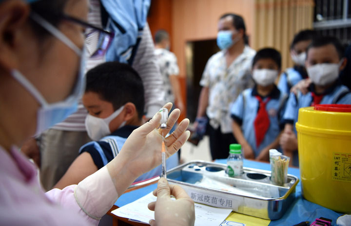 醫(yī)護人員在?谑协偵降谌W為學生接種疫苗(2021年10月28日攝)。新華社記者 郭程 攝
