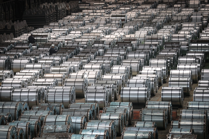 工人在鞍鋼集團鞍鋼股份冷軋廠四、五號鍍鋅線鍍鋅板卷成品區(qū)檢查產(chǎn)品(2021年4月20日攝)。新華社記者 潘昱龍 攝