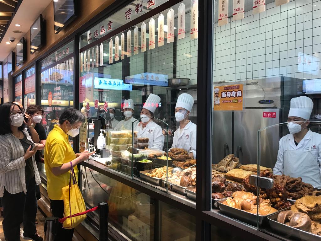 “現(xiàn)制現(xiàn)售的熟食是我們的一大招牌,伴隨熟食檔的開(kāi)啟,我們復(fù)商復(fù)市的腳步更快了!毙卵攀称凡惋嬁偙O(jiān)蔡夢(mèng)蕓說(shuō),看到店外的消費(fèi)者有序排隊(duì)進(jìn)入,自己頗為感慨,“我們期待的消費(fèi)回來(lái)了”。