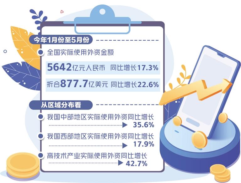 最新發(fā)布的數(shù)據(jù)顯示,2022年1月份至5月份,全國(guó)實(shí)際使用外資金額5642億元人民幣,同比增長(zhǎng)17.3%,折合877.7億美元,同比增長(zhǎng)22.6%。前5個(gè)月我國(guó)吸收外資保持了平穩(wěn)增長(zhǎng),這充分說(shuō)明我國(guó)在基礎(chǔ)設(shè)施、人力資源、產(chǎn)業(yè)配套等方面依然擁有較強(qiáng)的綜合比較優(yōu)勢(shì),市場(chǎng)吸引力不減。