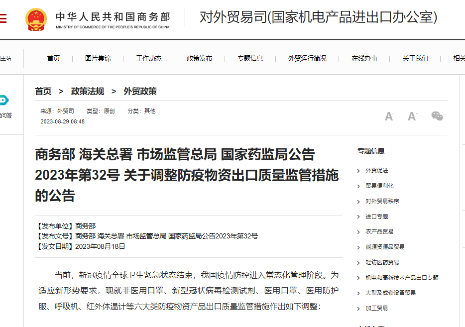 商務(wù)部 海關(guān)總署 市場監(jiān)管總局 國家藥監(jiān)局公告2023年第32號 關(guān)于調(diào)整防疫物資出口質(zhì)量監(jiān)管措施的公告