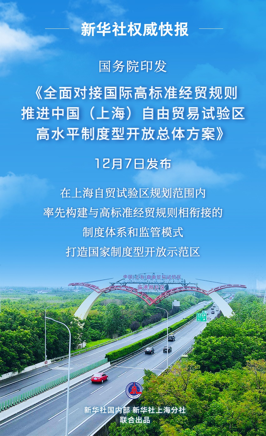 新華社北京12月7日電 國(guó)務(wù)院日前印發(fā)《全面對(duì)接國(guó)際高標(biāo)準(zhǔn)經(jīng)貿(mào)規(guī)則推進(jìn)中國(guó)(上海)自由貿(mào)易試驗(yàn)區(qū)高水平制度型開放總體方案》(以下簡(jiǎn)稱《總體方案》)。《總體方案》以習(xí)近平新時(shí)代中國(guó)特色社會(huì)主義思想為指導(dǎo),全面貫徹落實(shí)黨的二十大精神,穩(wěn)步擴(kuò)大規(guī)則、規(guī)制、管理、標(biāo)準(zhǔn)等制度型開放,在上海自貿(mào)試驗(yàn)區(qū)規(guī)劃范圍內(nèi),率先構(gòu)建與高標(biāo)準(zhǔn)經(jīng)貿(mào)規(guī)則相銜接的制度體系和監(jiān)管模式,打造國(guó)家制度型開放示范區(qū),為全面深化改革和擴(kuò)大開放探索新路徑、積累新經(jīng)驗(yàn)。