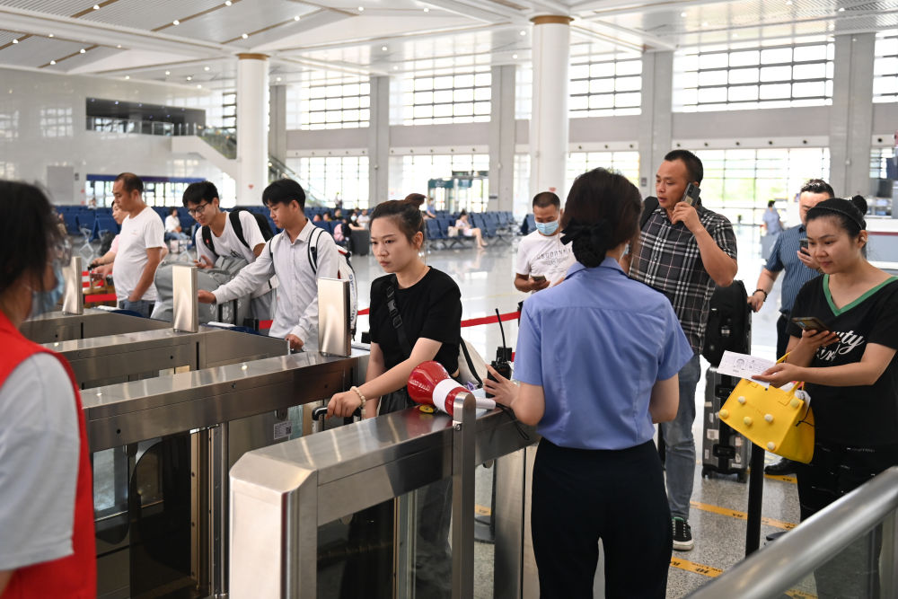截至2023年6月19日,我國首條民營控股高鐵——杭臺高鐵運送旅客超千萬人次。圖為旅客在浙江嵊州新昌站驗票登車。新華社記者黃宗治 攝