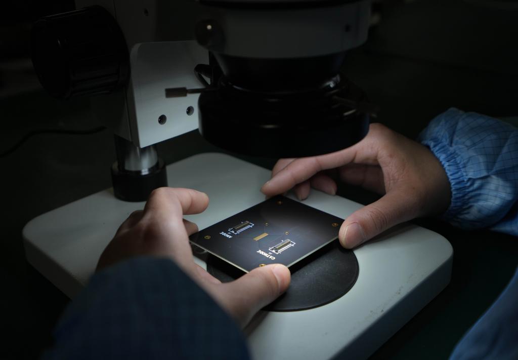 ??6月2日,工作人員在蘇州光電技術(shù)研究院的封裝測試公共服務(wù)平臺車間內(nèi)檢測一塊激光雷達(dá)芯片。新華社記者 李尕 攝