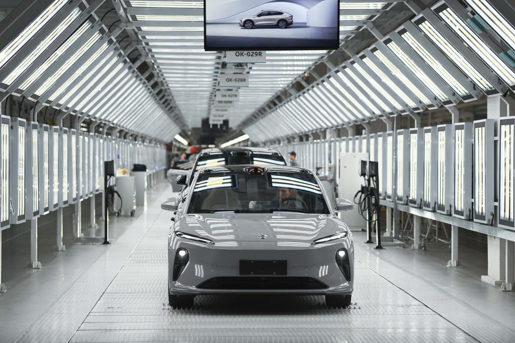 ??這是在安徽省合肥市新橋智能電動(dòng)汽車產(chǎn)業(yè)園蔚來(lái)第二工廠拍攝的新能源汽車生產(chǎn)線(5月9日攝)。新華社記者 張端 攝