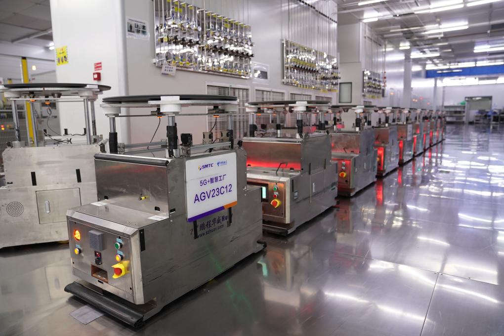 ??6月4日,在位于江西省南昌市高新區(qū)的江西兆馳半導(dǎo)體有限公司外延車間,AGV自動(dòng)轉(zhuǎn)運(yùn)小車在5G技術(shù)支持下進(jìn)行自動(dòng)搬運(yùn)。新華社記者 周密 攝