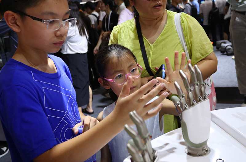 ??7月5日,在2024世界人工智能大會,小朋友在傲意科技機(jī)器人靈巧手展品旁參觀。新華社記者 方喆 攝