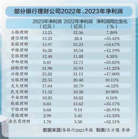 在規(guī)模沒有得到明顯增長和響應減費讓利號召的背景下,行業(yè)經營業(yè)績整體出現(xiàn)下滑,部分公司更是出現(xiàn)“增量不增收”的窘境。中國證券報記者梳理多家銀行年報發(fā)現(xiàn),2023年,中郵理財、興銀理財、青銀理財、中銀理財、招銀理財凈利潤均較2022年減少超10%,農銀理財、建信理財、渝農商理財凈利潤均較2022年減少超50%。
