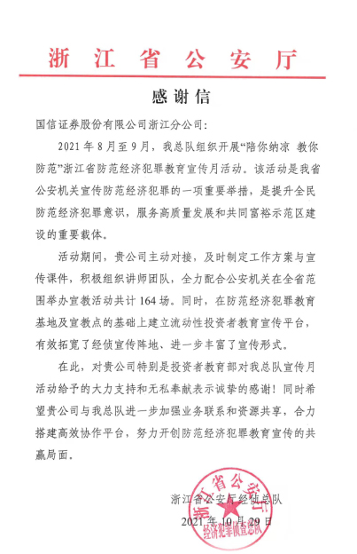 2021年,投教基地舉辦的系列投教活動獲得浙江省公安廳、浙江證監(jiān)局、中國人民銀行杭州中心支行等單位的好評。浙江省公安廳經(jīng)偵總隊(duì)向國信證券浙江分公司發(fā)來感謝信,感謝國信證券浙江分公司對“陪你納涼 教你防范”浙江省防范經(jīng)濟(jì)犯罪教育宣傳月活動給予的大力支持。