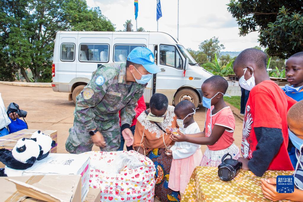2021年6月1日,在剛果(金)東部城市布卡武的SOS兒童村,中國第24批赴剛果(金)維和醫(yī)療分隊的隊員把糖果分給孩子們。新華社發(fā)