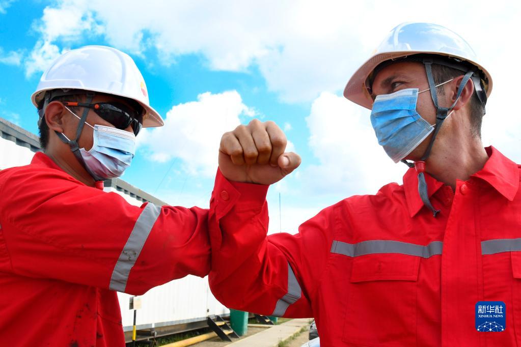 2020年11月27日,中國石油集團(tuán)長城鉆探工程公司古巴項目GW91鉆井平臺中方員工(左)同古方員工互相致意。新華社發(fā)(華金·埃爾南德斯攝)