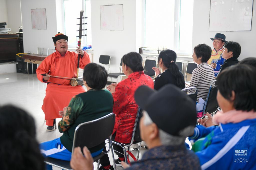 內蒙古興安盟科爾沁右翼中旗巴彥敖包嘎查的蒙古族村民在鄉(xiāng)村文化活動室表演蒙古族藝術烏力格爾(2019年4月17日攝)。新華社記者 彭源 攝