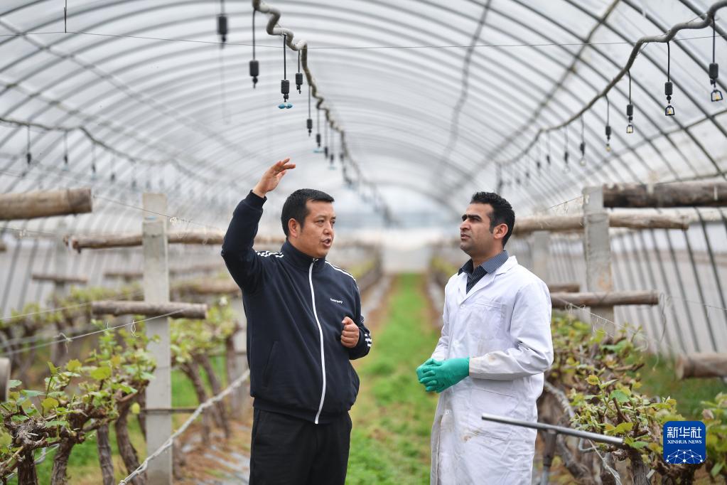 2021年3月17日,來自巴基斯坦的留學(xué)生(右)在陜西楊凌錦田農(nóng)業(yè)專業(yè)合作社向當?shù)芈殬I(yè)農(nóng)民了解水肥一體化灌溉設(shè)備。新華社記者 張博文 攝