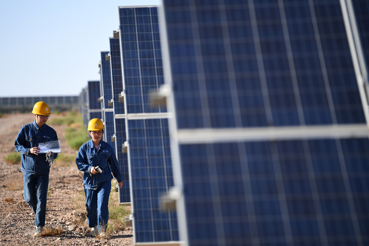 光伏電站工作人員在甘肅省金昌市華能集團(tuán)西坡光伏電站現(xiàn)場(chǎng)巡檢(2022年6月13日攝)。新華社記者 陳斌 攝