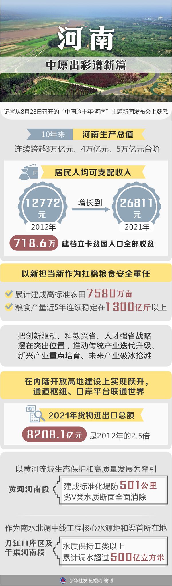 10年來,河南生產(chǎn)總值連續(xù)跨越3萬億元、4萬億元、5萬億元臺(tái)階,居民人均可支配收入從2012年的12772元增長(zhǎng)到2021年的26811元,718.6萬建檔立卡貧困人口全部脫貧。