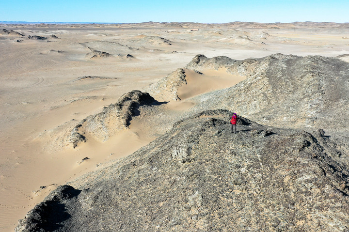 2021年1月,尼瑪老人在戈壁石山上眺望邊境線。新華社記者 連振 攝