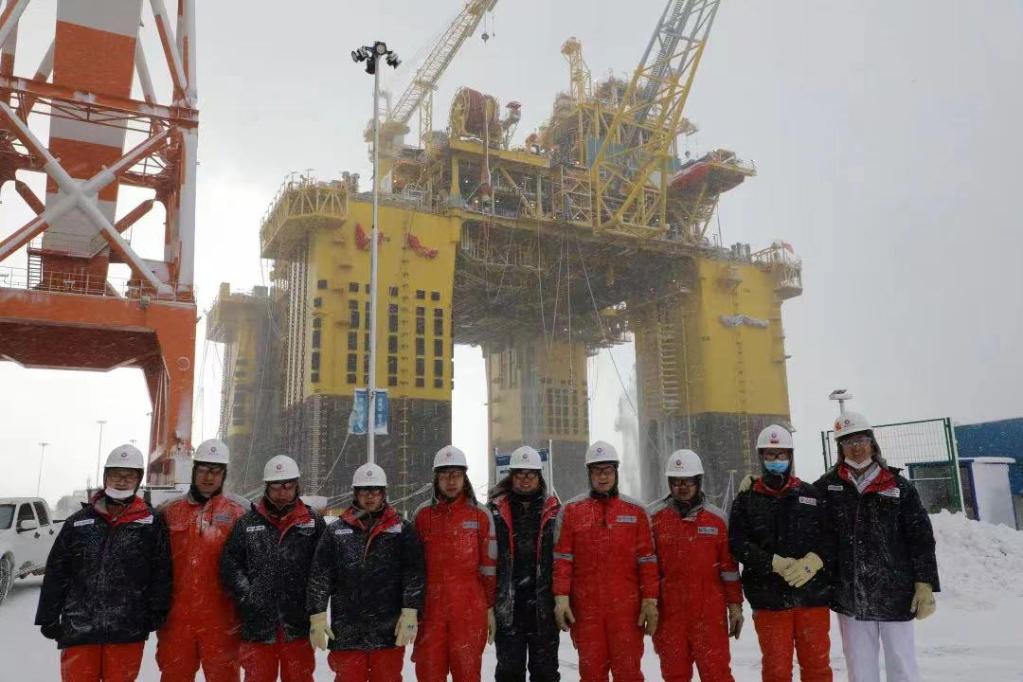 “深海一號”開發(fā)生產(chǎn)團隊在煙臺建造場地合影。(受訪對象供圖)