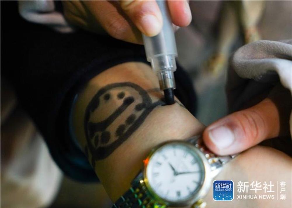 ↑1月3日,朱梓芮在站臺上將母親手腕上稍有模糊的“手表”描繪清晰。 新華社記者 胡晨歡 攝