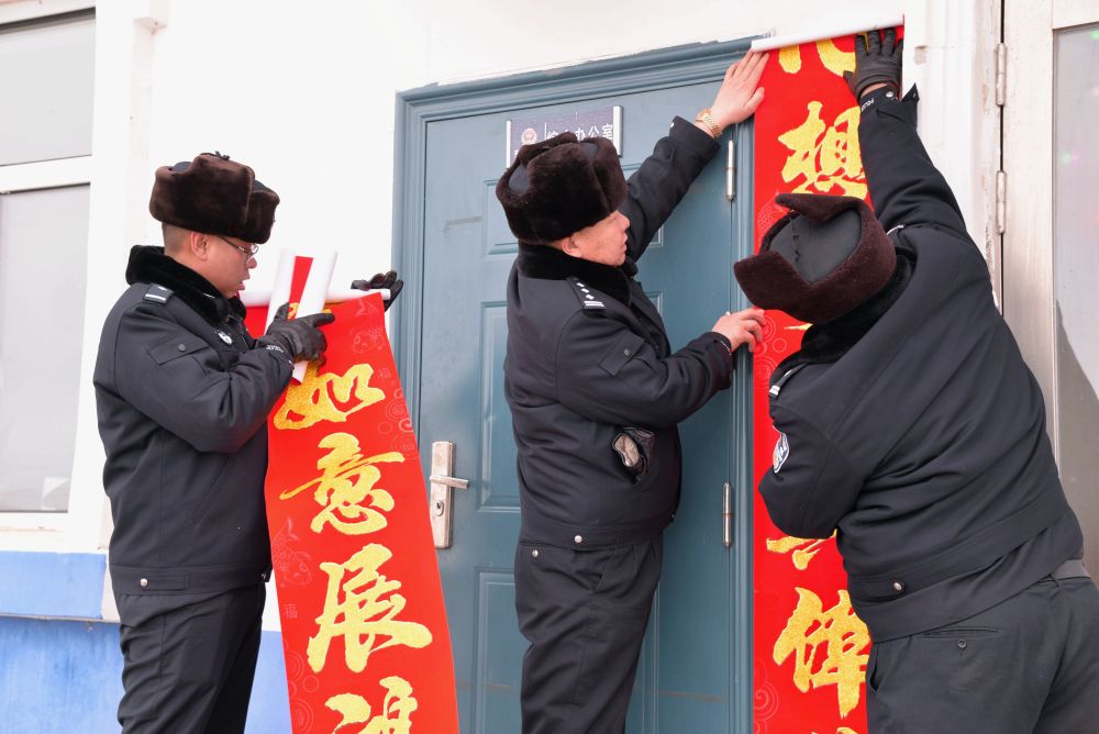 ↑1月22日,呼倫貝爾市公安局呼倫湖國(guó)家級(jí)自然保護(hù)區(qū)分局西岸聯(lián)勤所民警在辦公室外張貼春聯(lián)。