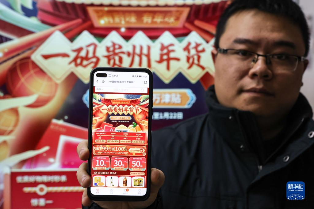 1月18日,工作人員通過(guò)手機(jī)展示“一碼貴州”年貨節(jié)線上下單頁(yè)面。新華社記者 歐東衢 攝