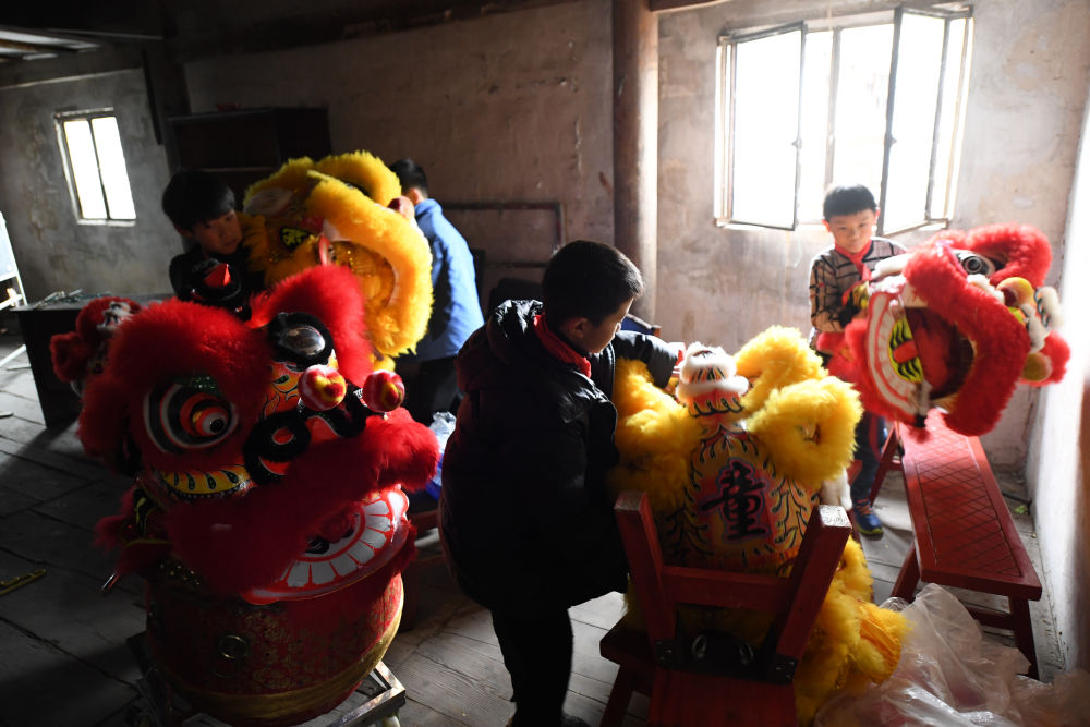 ↑1月21日,在前童古鎮(zhèn)祠堂,古鎮(zhèn)舞獅隊(duì)在訓(xùn)練。