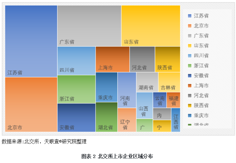 從區(qū)域分布來看,以江蘇、北京、廣東、山東為代表的制造業(yè)和科技創(chuàng)新省份,以涵蓋53家上市企業(yè)占據(jù)北交所的半壁江山。其中,江蘇囊括17家北交所公司位居榜首,北京、廣東分別以13家、12家緊隨其后,山東則以11家位列第四。