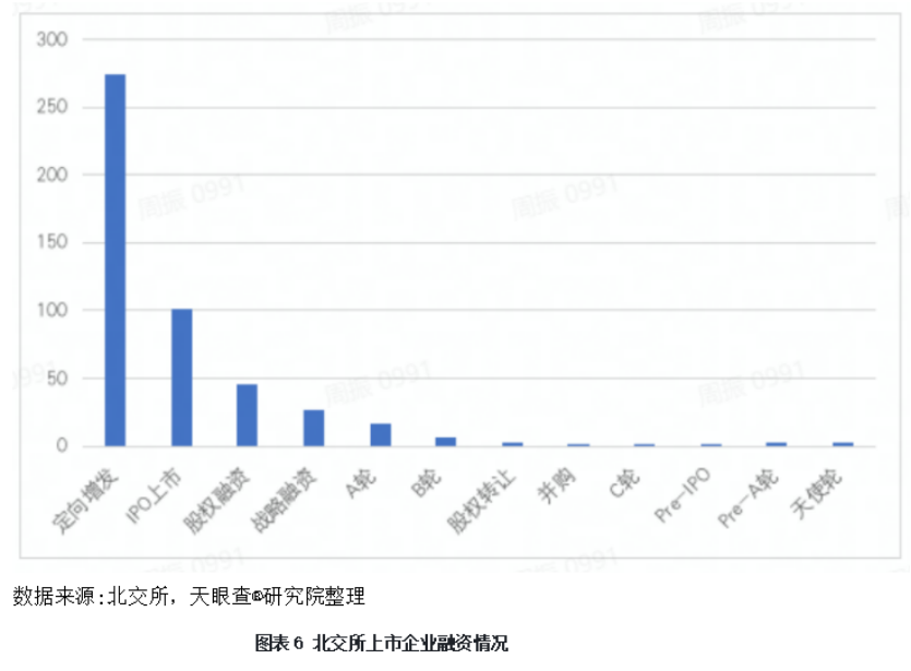 截止到2022年6月30日,北交所101家已上市企業(yè)中,共發(fā)生融資事件481次(不含觀典防務(wù)科創(chuàng)板轉(zhuǎn)板上市)。其中,定向增發(fā)274次,戰(zhàn)略融資27次,A輪融資27次,B輪融資16次。從融資情況可以看出,北交所上市企業(yè)在企業(yè)發(fā)展初期受到風(fēng)險(xiǎn)資本投資較少,定向增發(fā)是主要融資手段。