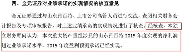 金元證券稱(chēng),通過(guò)與山東雅百特、上市公司高管人員進(jìn)行交流,查閱相關(guān)財(cái)務(wù)會(huì)計(jì)報(bào)告及專(zhuān)項(xiàng)審核報(bào)告,對(duì)業(yè)績(jī)承諾的實(shí)現(xiàn)情況進(jìn)行了核查,并表態(tài)稱(chēng),“經(jīng)核查,本獨(dú)立財(cái)務(wù)顧問(wèn)認(rèn)為:本次重大資產(chǎn)重組涉及的山東雅百特 2015 年度實(shí)現(xiàn)的凈利潤(rùn)超過(guò)業(yè)績(jī)承諾水平,2015 年度盈利預(yù)測(cè)承諾已經(jīng)實(shí)現(xiàn)!