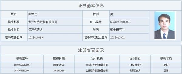 中證協(xié)公示信息顯示,陳綿飛為碩士研究生學(xué)歷,2004年入職金元證券,2012年獲得保薦代表人執(zhí)業(yè)資格,目前仍在金元證券任職,從業(yè)資格證書(shū)有效期截至2018年12月31日。
