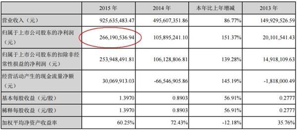 雅百特最初發(fā)布的2015年報(bào)顯示,該公司2015年實(shí)現(xiàn)營(yíng)收9.26億元、同比增長(zhǎng)86.77%,實(shí)現(xiàn)股東凈利潤(rùn)2.66億元、同比增長(zhǎng)151.37%,同時(shí)扣非凈利潤(rùn)也達(dá)到2.54億元、同比增長(zhǎng)139.28%,完成了業(yè)績(jī)承諾。