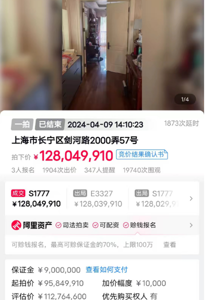 4月9日,阿里拍賣平臺(tái)顯示,經(jīng)過3名報(bào)名競(jìng)價(jià)者1904次出價(jià)競(jìng)爭(zhēng),上海市長(zhǎng)寧區(qū)一套建筑面積達(dá)600平方米的豪宅,最終以1.28億元成交,高出評(píng)估價(jià)約1530萬元,成交單價(jià)達(dá)到21.32萬元/平方米。