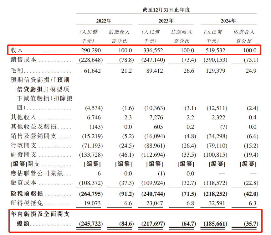 招股說明書顯示,2022年、2023年及2024年,海馬云營業(yè)收入分別為2.9億元、3.37億元和5.20億元,凈利潤分別為-2.46億元、-2.18億元和-1.86億元。