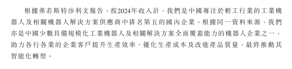 根據(jù)弗若斯特沙利文報告,按2024年收入計,公司是中國專注于輕工行業(yè)的工業(yè)機(jī)器人及相關(guān)機(jī)器人解決方案供應(yīng)商中排名第五的國內(nèi)企業(yè),是中國少數(shù)具備規(guī)?;I(yè)機(jī)器人及相關(guān)解決方案全面覆蓋能力的機(jī)器人企業(yè)之一,助力各行各業(yè)的企業(yè)客戶提升生產(chǎn)效率、優(yōu)化生產(chǎn)成本及改進(jìn)產(chǎn)品質(zhì)量,最終推動其智能化轉(zhuǎn)型。